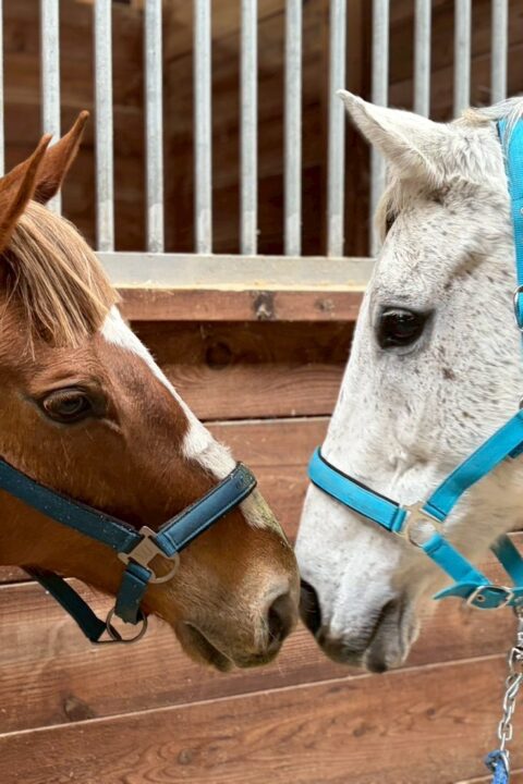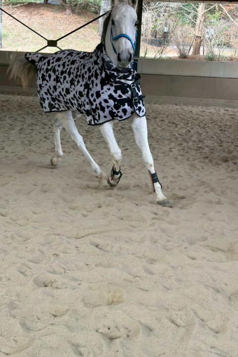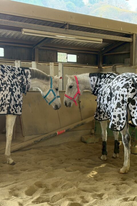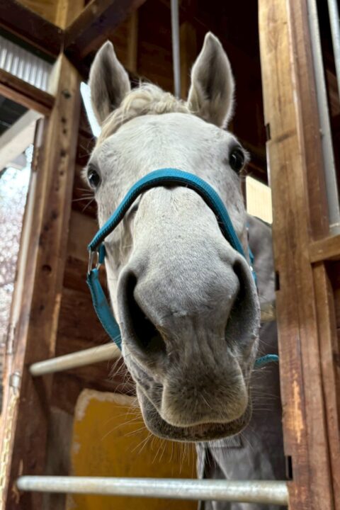 身体が大きく綺麗な芦毛です。 近寄ると最初は耳を伏せますが顔も撫でさせてくれます。 手入れ中も大人しく、とても良い子です。繁殖牝馬上がりということもあるのか、我慢強いように思えます。 誰よりもルンルンと放牧地に向かう様子がとても可愛らしいです。 放牧では子供のように無邪気に飛び跳ねたり走ったりしています。