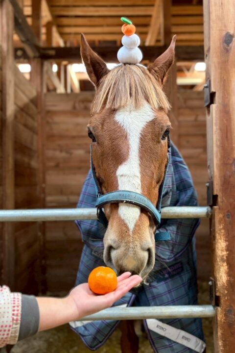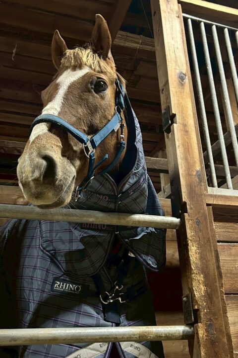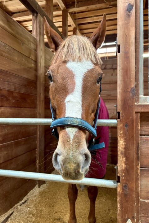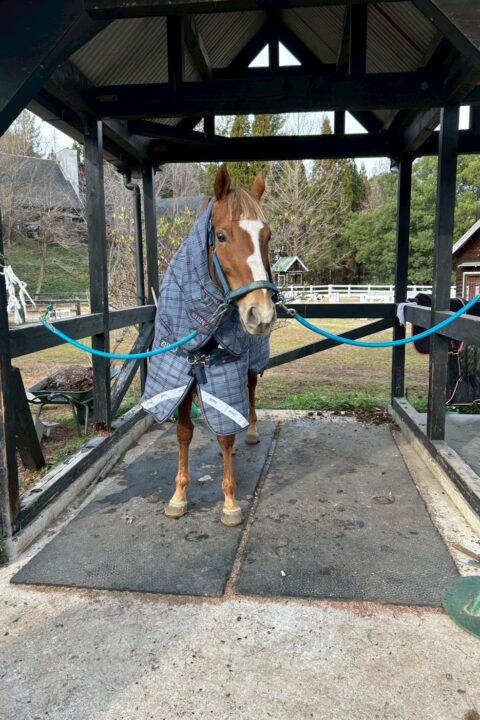 とてもおっとりしています。 年齢的にはまだ若いはずなのですが、隣の馬場で馬が走っていても気にせず曳馬出来たりと、とても肝の据わった女の子です。 ホースレストに着いてすぐ環境の変化で体調を崩しましたがすっかり元気になり、ご飯も沢山食べ、足りない!と言うまでになりました。 放牧では41.42番目と一緒に出すと、いつも馬房が隣の42番目の後ろをついて回っています。 人にも甘え上手なのですりすりしたりととても甘えん坊です。