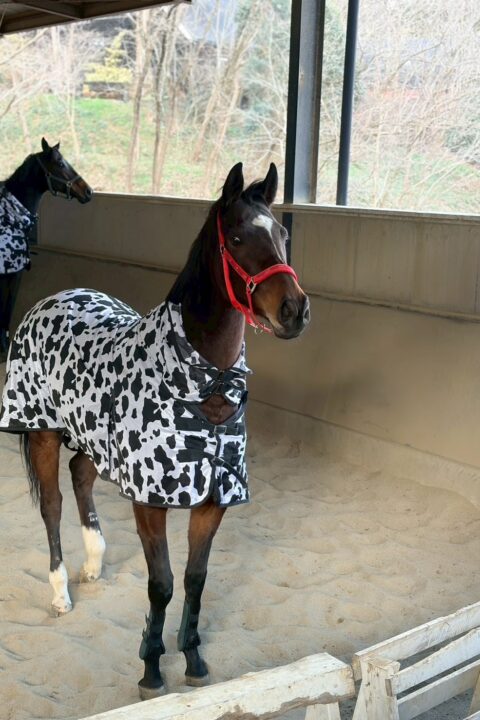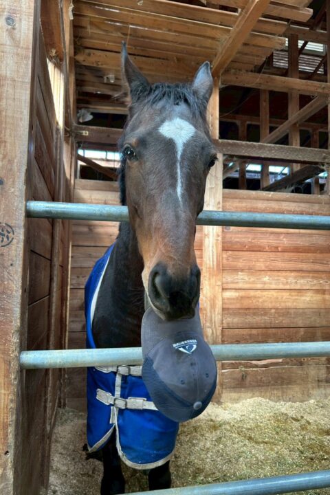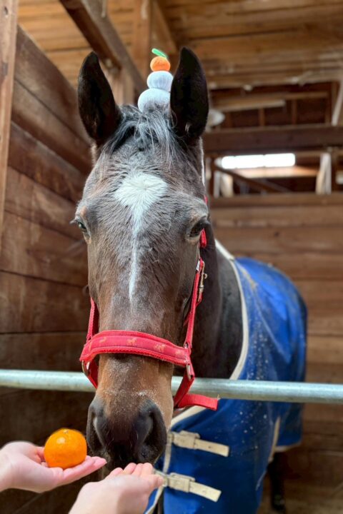 - A.少し怖がりなところがあり、馬房に入ったり、洗い場に入ったりするのを 躊躇することがあるので、今は怖くないことを知ってもらうために馬のペースに合わせて練習中です! 放牧地では元気に走り回っており、研修生の帽子で遊んだりとお茶目な一面も見せてくれています!