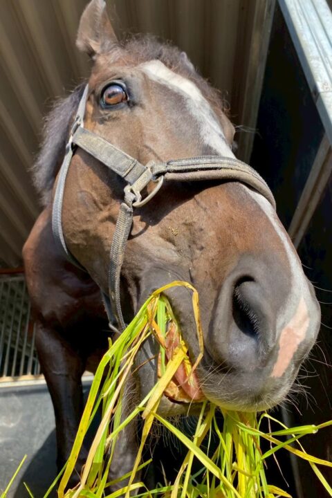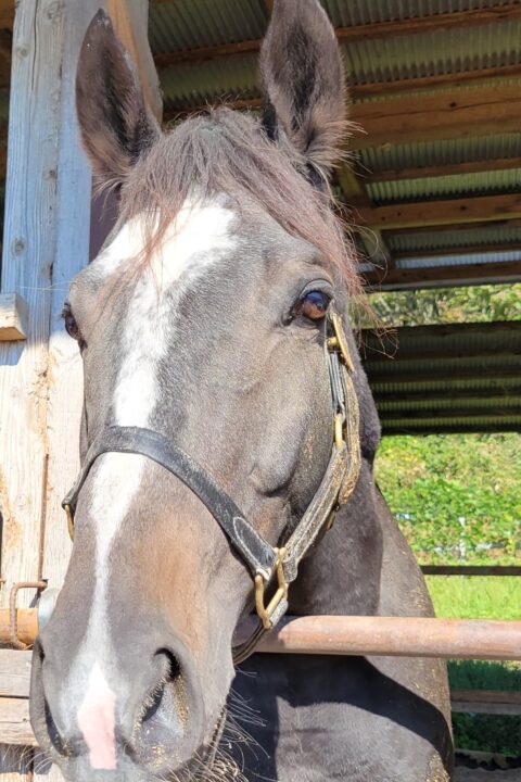 - 令和5年の11月、肥育場には8頭ほどの馬が存在していました。まだ若そうで、黒っぽい額に大きな流星(白い模様)が特徴的なこの子の持つ可能性を十分に伸ばしてあげたい!そんな思いが強く芽生えてきたため、この子を Retouchで引き取ることを決めました。