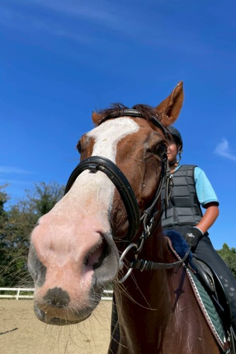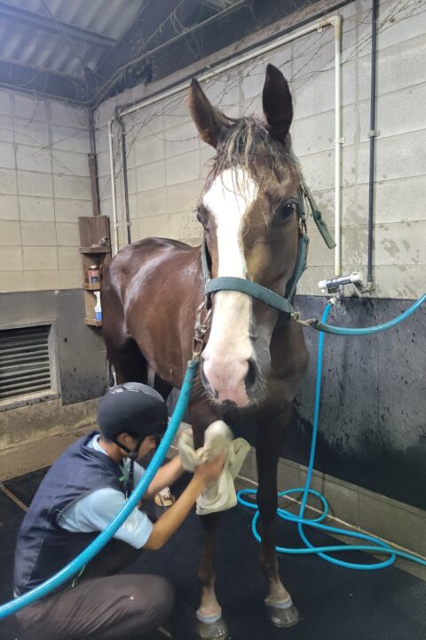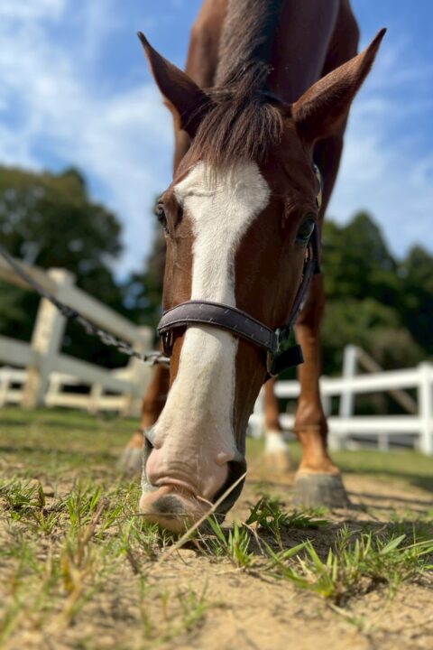 肥育場にいる時とは全く馬の表情が違います。性格も柔らかくなってとても素直で生徒たちを癒している存在です。