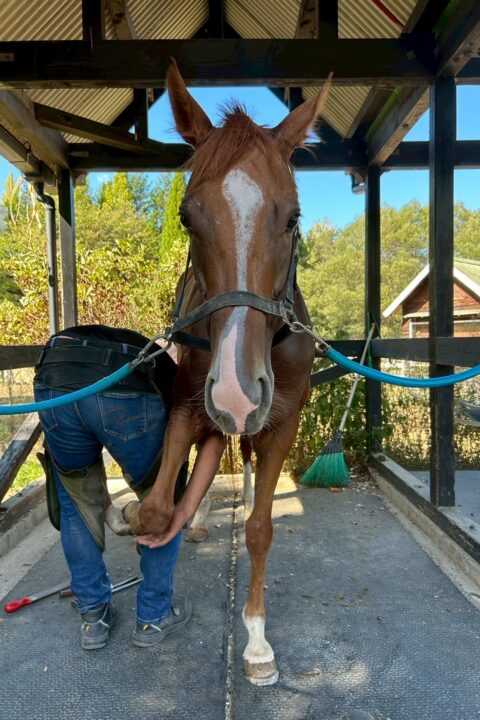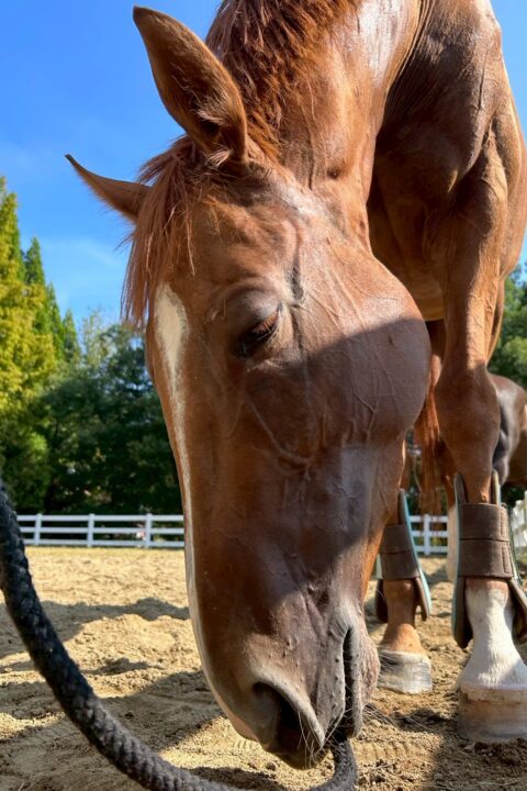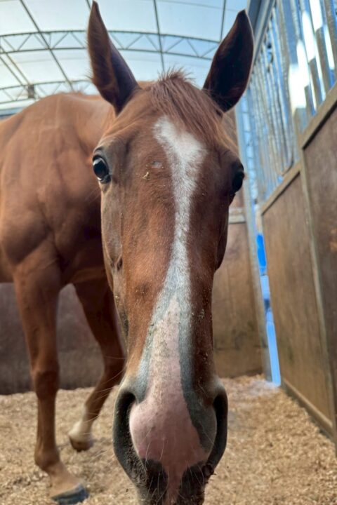 令和7年8月下旬、32番目・33番目の子を同時に受け入れました。この子は、30番目の栗毛ちゃんがなかなか捕まらない時、ずっと、向かい側の馬房から身を乗り出してみていました。
